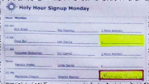 The blurred tearoff of the Signup Sunday poster form shows how things work. Using the poster thoughout the Sunday signup process parishioners look at the needs and sign up for hours. Various explanations are given to them. Often the homily incorporates Eucharistic Adoration. Adorer signup. They fill out Signup forms such as those available on this website's collaberation page, those signin forms are entered into the Adoration Servants system, and the adoration is stronger by new adorers.