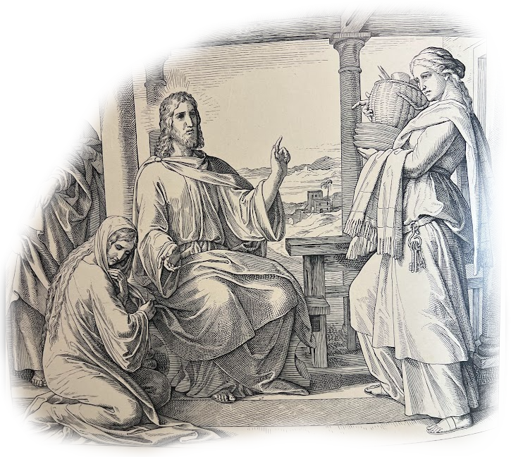 And she had a sister called Mary. who, sitting also at the Lord's feet, heard his word. But Martha was busy about much serving. Who stood and said: 'Lord, hast thou no care that my sister hath left me alone to serve? Speak to her therefore, that she help me.' And the Lord answering, said to her: 'Martha, Martha, thou art careful and art troubled about many things: But one thing is necessary. Mary hath chosen the best part, which shall not be taken away from her.'" (Luke 10:38-42)